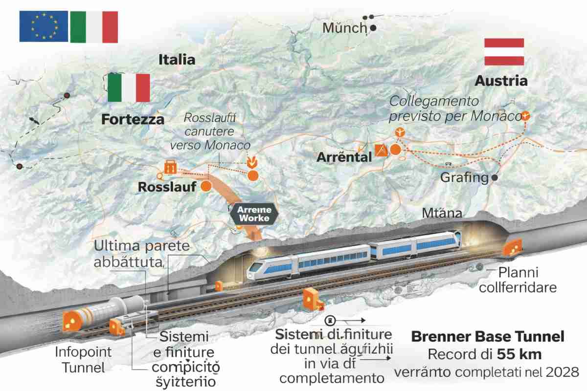 Questa grande infrastruttura, che collega l’Italia con l’Austria, è destinata a diventare il tunnel ferroviario più lungo e profondo del continente, con una lunghezza complessiva di circa 64 chilometri. Il tunnel, infatti, attraverserà le Alpi, unendo Fortezza in Alto Adige con Innsbruck in Austria, e rappresenta una parte fondamentale del corridoio europeo TEN-T, che mira a migliorare la rete di trasporti continentale.